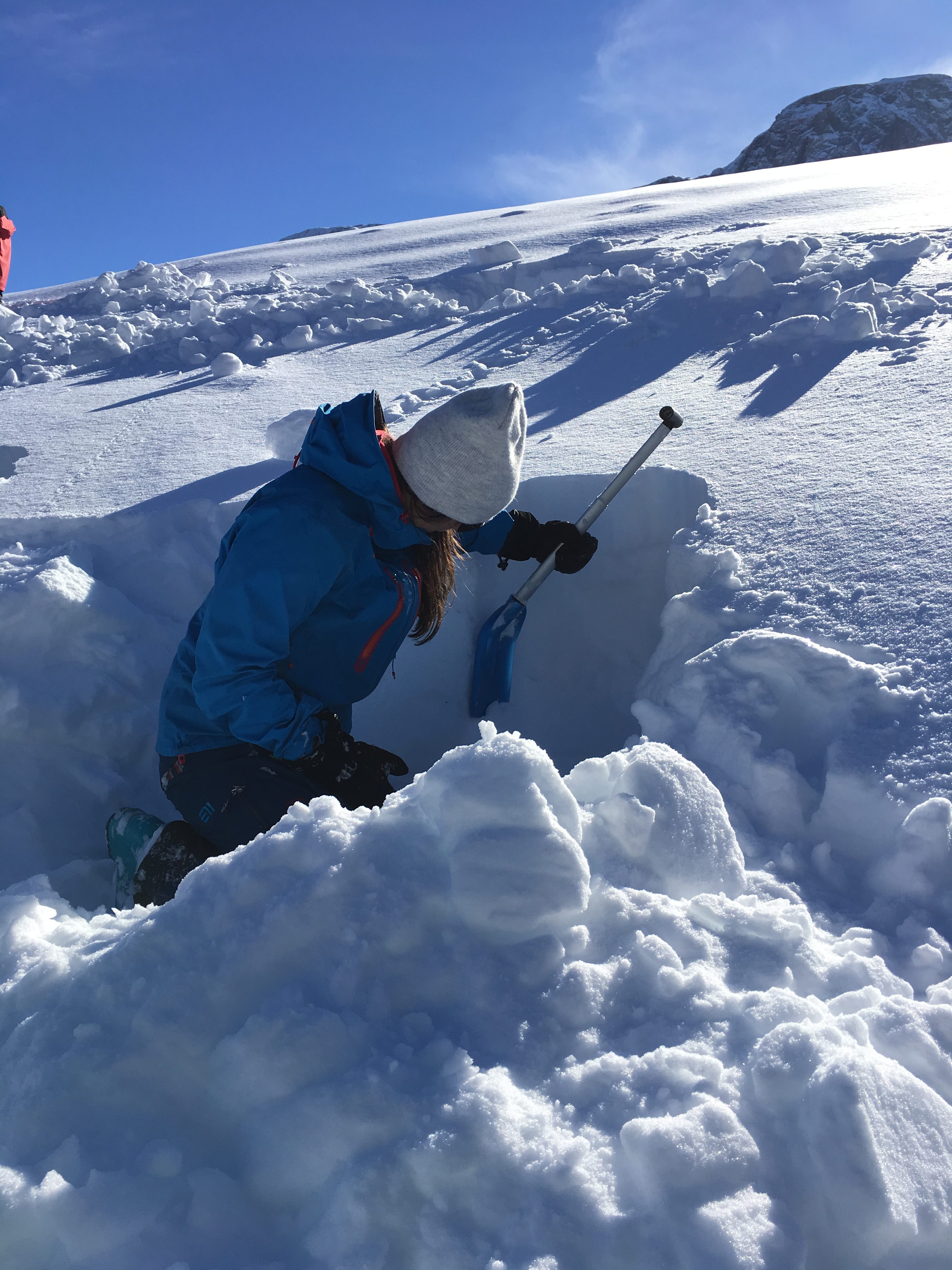 Am Praxistag geht es für uns bei 4 Stationen ans Eingemachte. Wir besprechen die verschiedenen Arten von LVS Geräten, testen wie sich unterschiedliche Dinge, wie Rucksack, Mensch oder Stein beim Sondieren anfühlen und graben Schneeprofile. Im Schneeprofil sind die Schwachschichten und Probleme deutlich erkennbar.